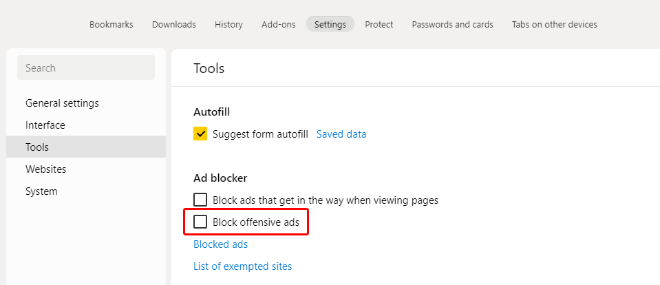 "मुख्य मेनू> सेटिंग> सेटिंग टैब> टूल> आपत्तिजनक विज्ञापनों को ब्लॉक करें" विकल्प अक्षम है