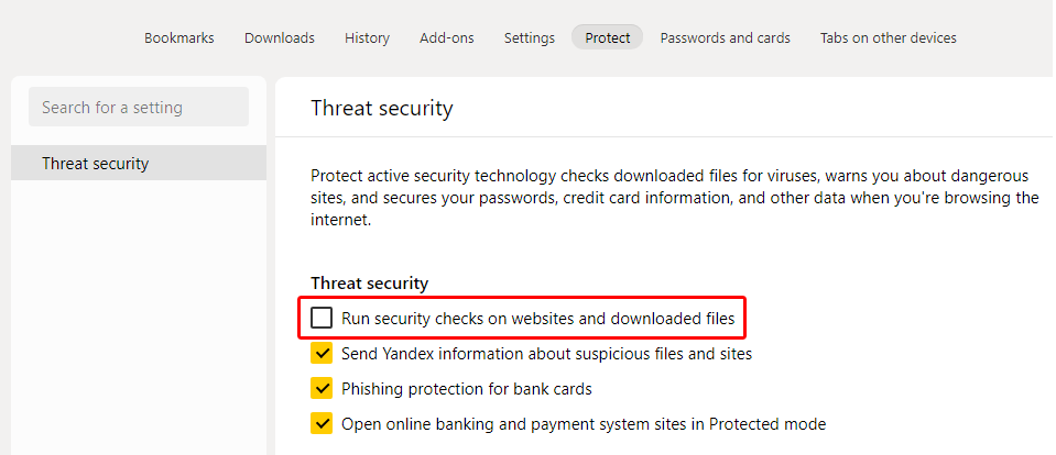 "मेन मेन्यू> सेटिंग्स> प्रोटेक्ट टैब> थ्रेट सिक्योरिटी> वेबसाइटों और डाउनलोड की गई फाइलों पर सुरक्षा जांच चलाएं" विकल्प अक्षम है